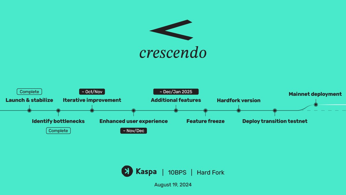 The Official Kaspa X Profile: #ICYMI – Here’s the roadmap for the #Kaspa #Crescendo Hardfork. #10BPS and so much more are in the works!Details: https://t.co/QrFQQ0dPuu$KAS pic.twitter.com/Fq24YY22Mp August 21, 2024